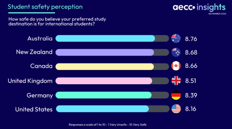 AECC(AECC Insights Student Survey)近日發布的《全球留學趨勢報告》中顯示,澳大利亞以8.76分(滿分10分)的高分位居榜首,被認為是最安全的留學目的地;